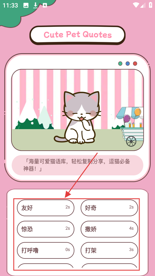 2、进入猫语相关页,有【友好】【好奇】等猫语选项,选不同选项,触发对应猫语,逗猫玩耍。