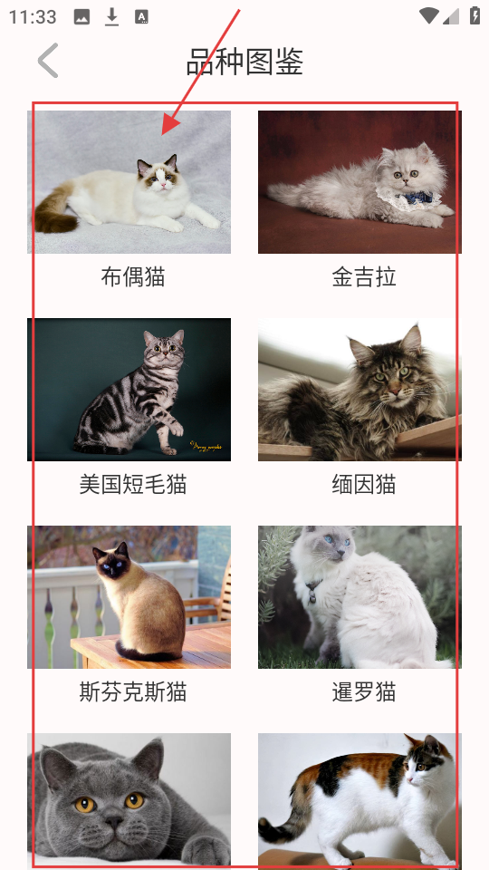 3、进入品种图鉴页,有布偶猫、金吉拉等多种猫咪品种,选喜欢的品种,查看详细介绍。