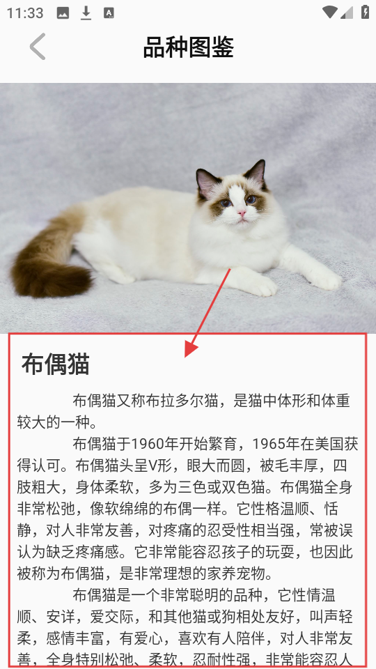 4、查看布偶猫详情,了解其又称布拉多尔猫,体型大、性格温顺等特点,助力了解猫咪品种。