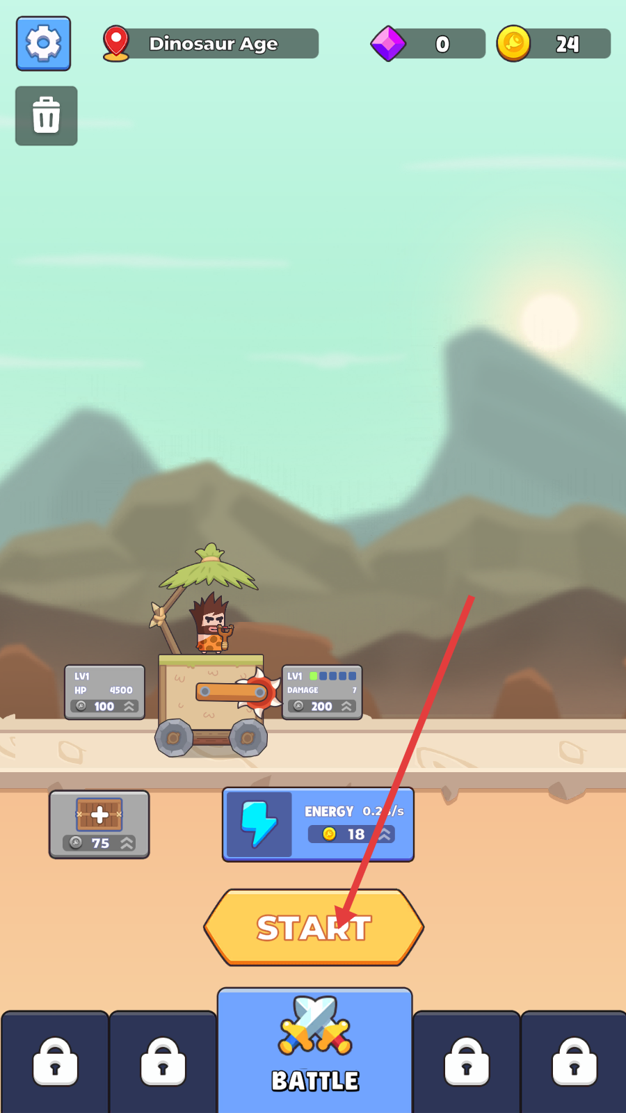 1、进入【Dinosaur-Age】场景后,点击【START】按钮开始游戏,留意角色与车辆的初始属性,为冒险做准备。