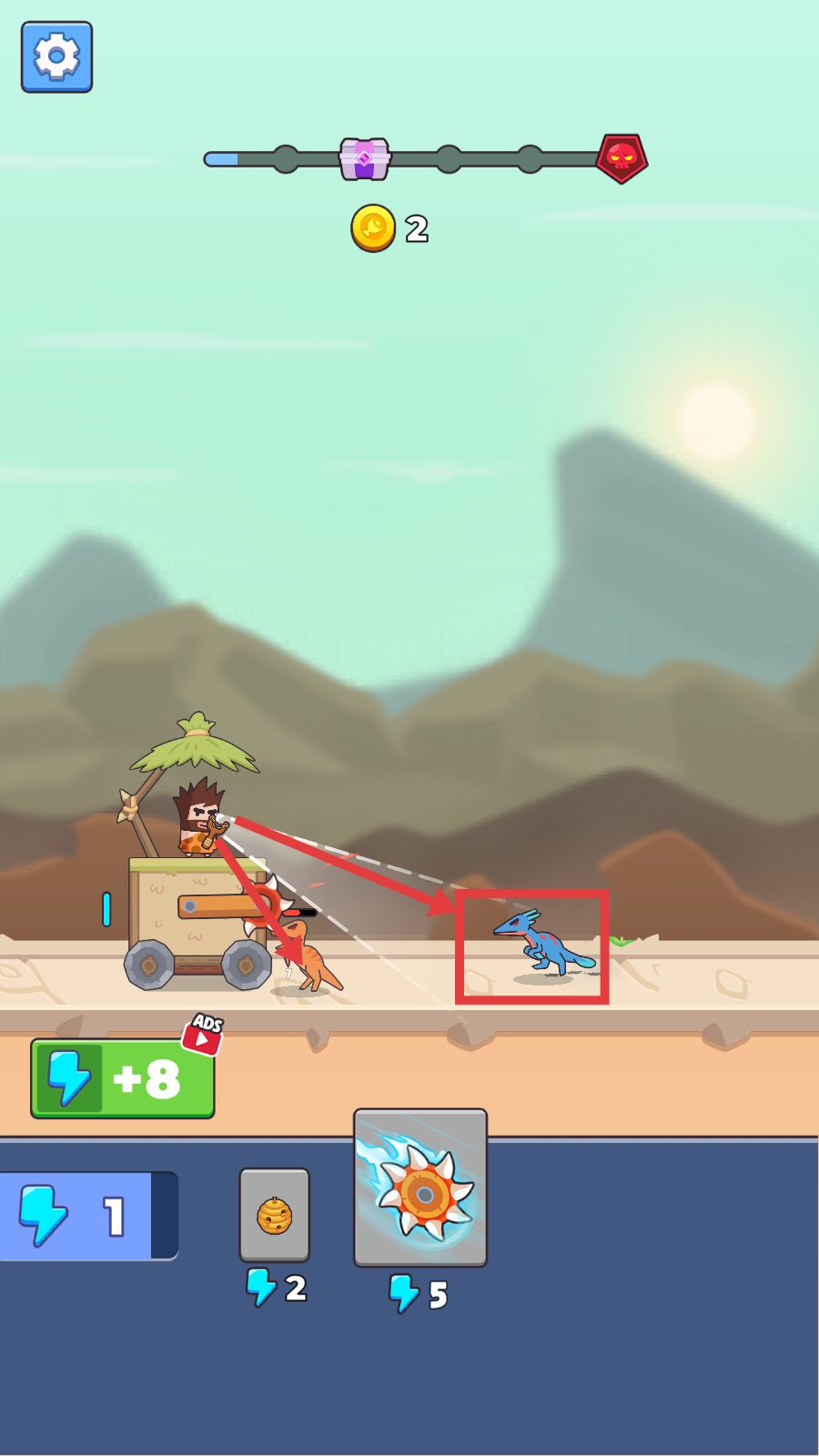 2、战斗时操控角色攻击蓝色恐龙等敌人,收集【2-金币】,同时获取能量,积累资源助力后续战斗。