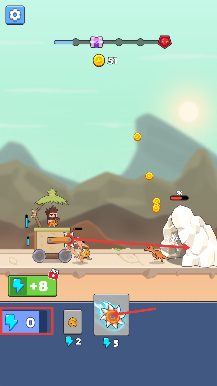3、利用旋转齿轮等道具攻击岩石、恐龙,能积累更多金币,不过要留意能量(蓝色闪电)的消耗情况。