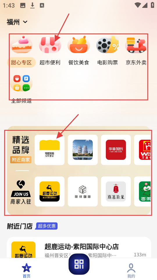 1、进入首页,有【甜心专区】【超市便利】等分类,还有精选品牌板块,选分类或品牌,查找商家。