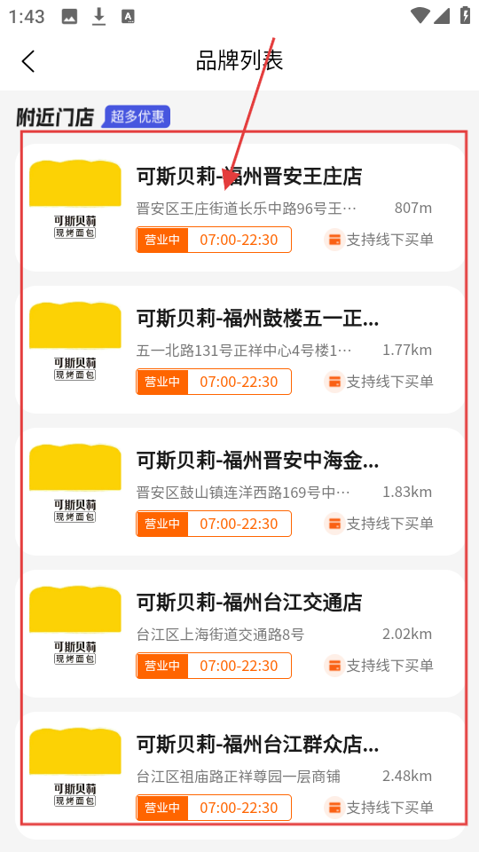 2、进入品牌列表,可看品牌旗下各门店,选要去的门店,查看营业时间、距离等信息,规划到店。