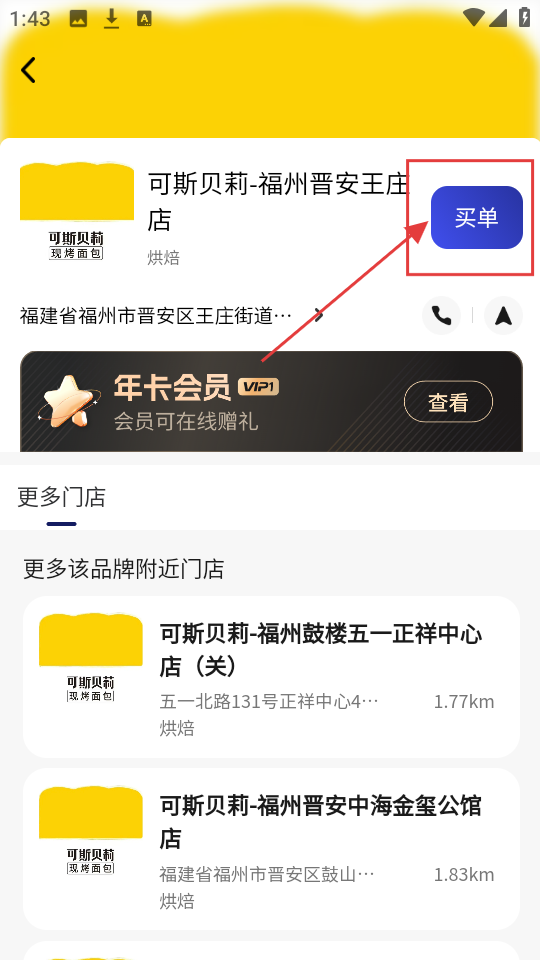3、进入门店详情页,可看门店地址等信息,点【买单】,进行消费结账,完成购物流程。