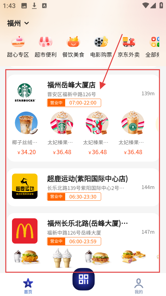4、在首页还可以下滑页面,看附近门店,如星巴克、麦当劳等,选感兴趣的门店,查看营业状态、商品等,前往消费。