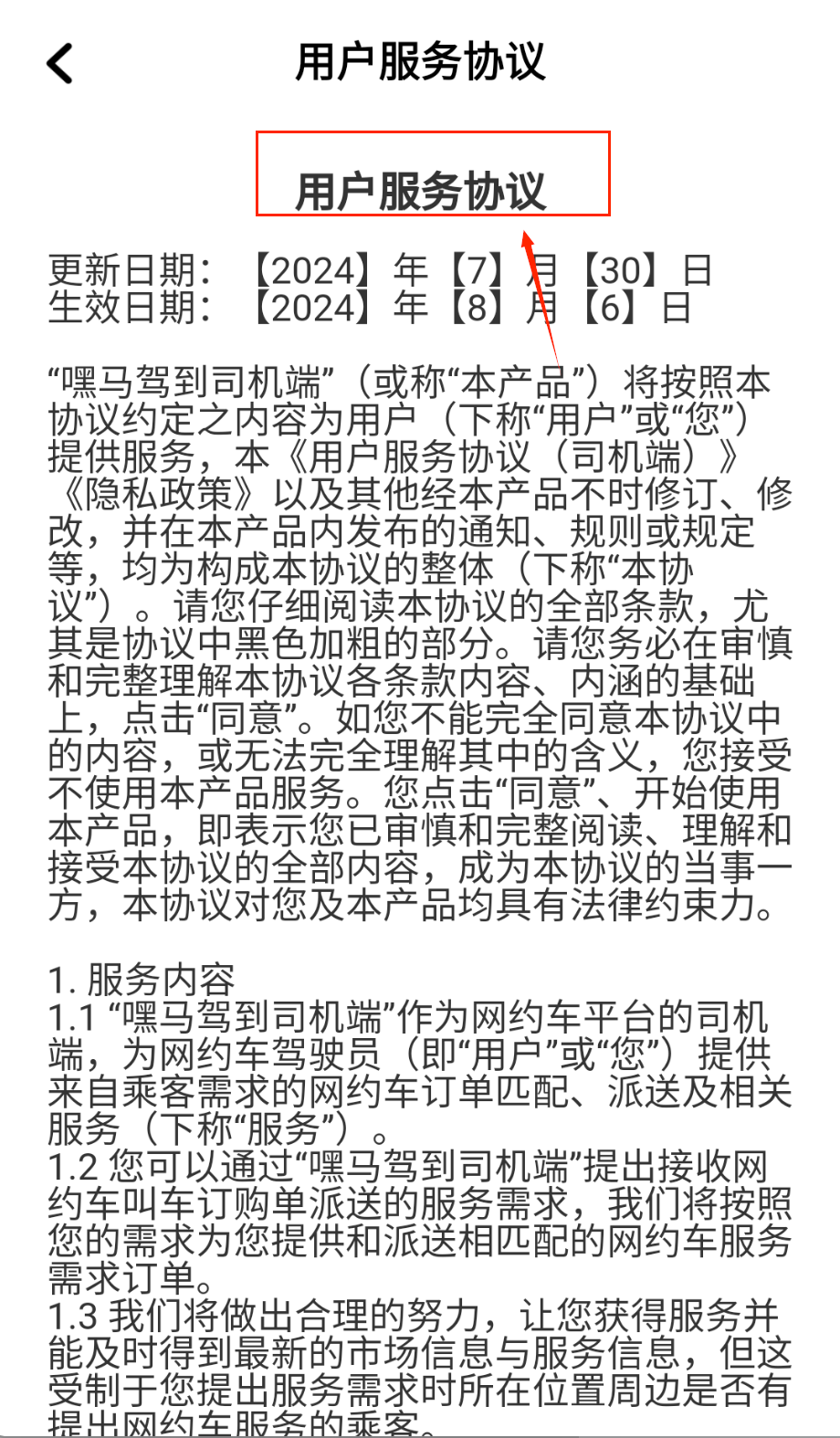 1、首先记得留意下协议的更新日期和生效日期哦,打开软件后要仔细阅读用户服务协议特别是加粗部分,了解清楚平台会为你匹配网约车订单。