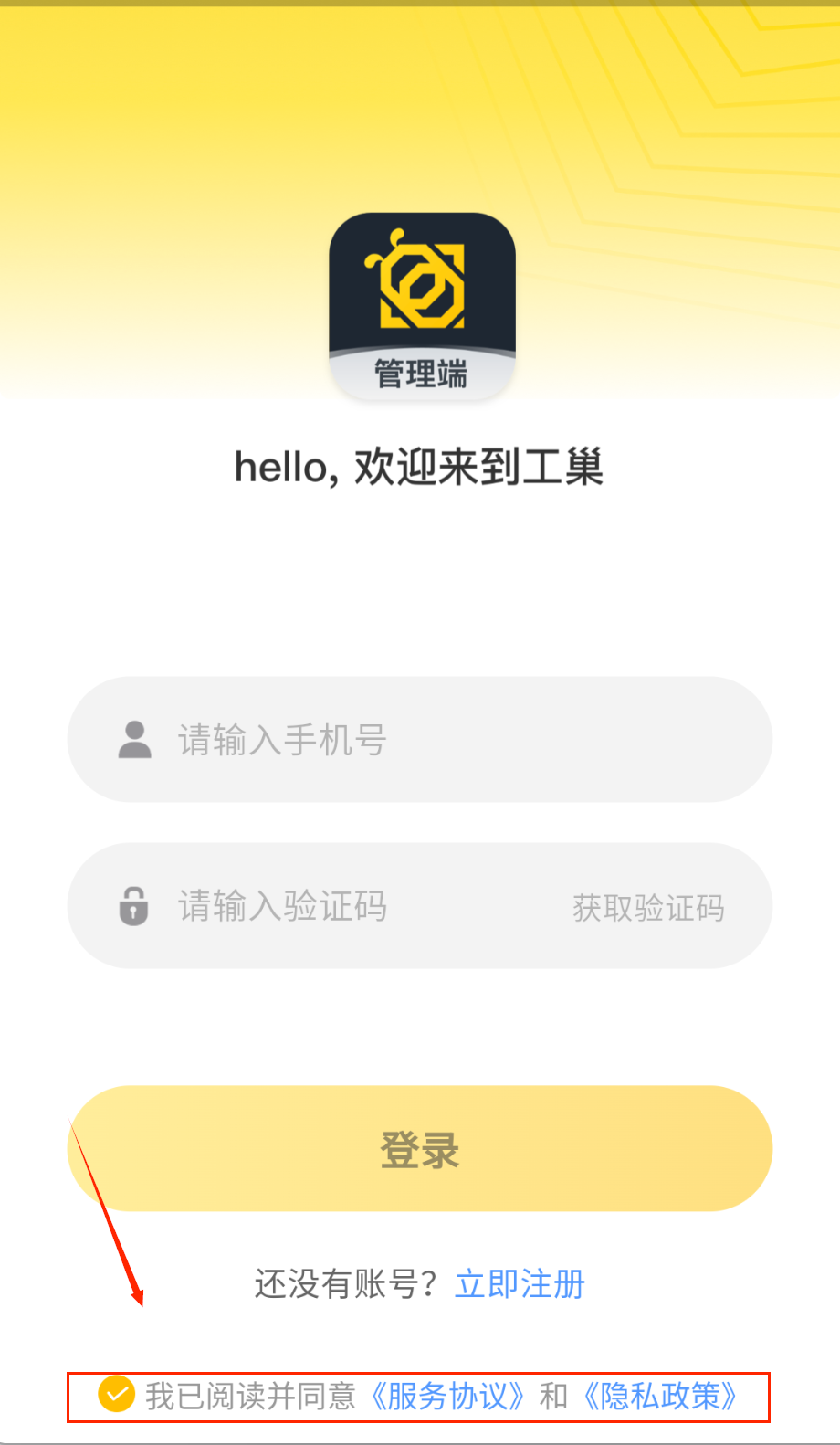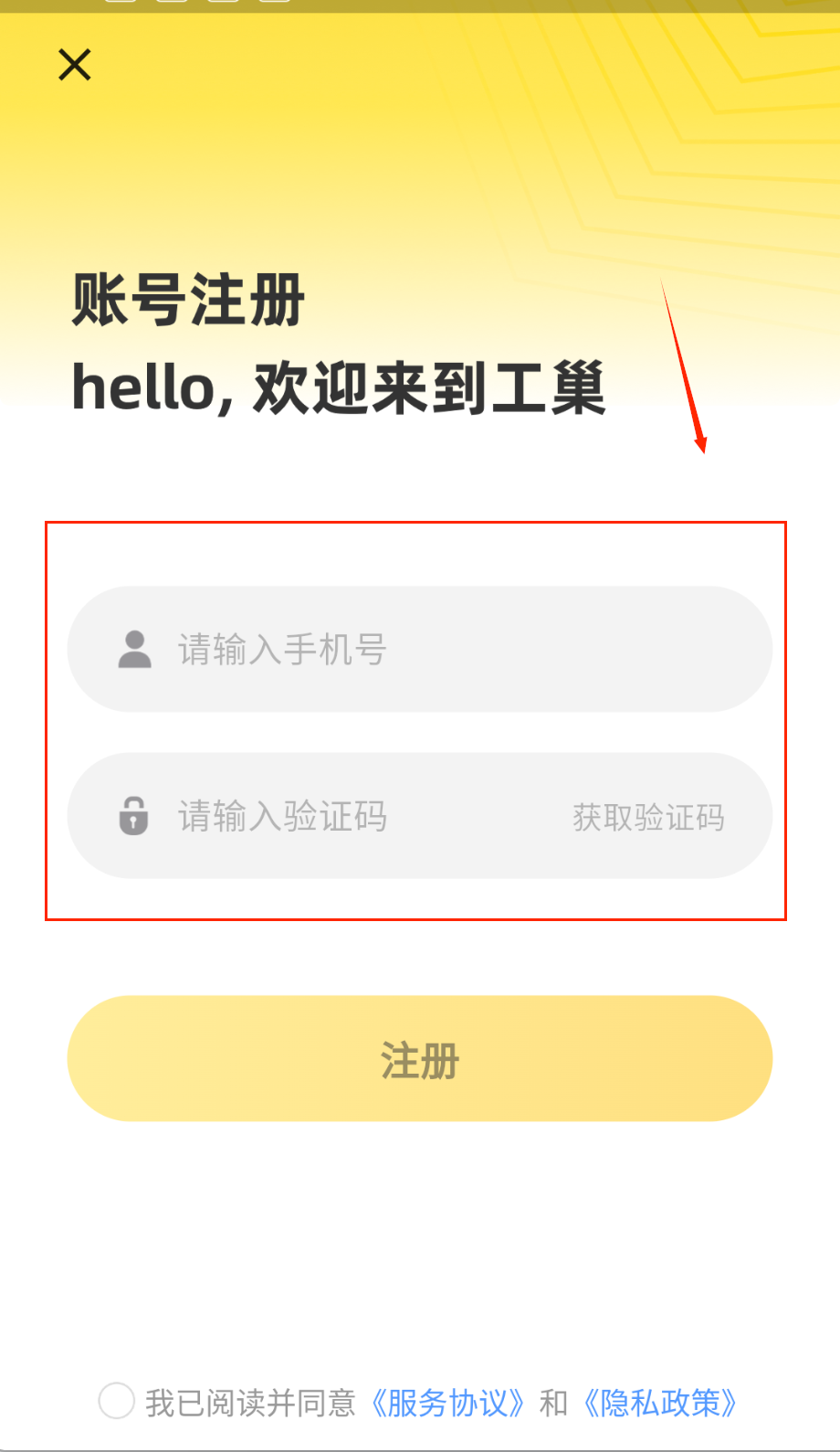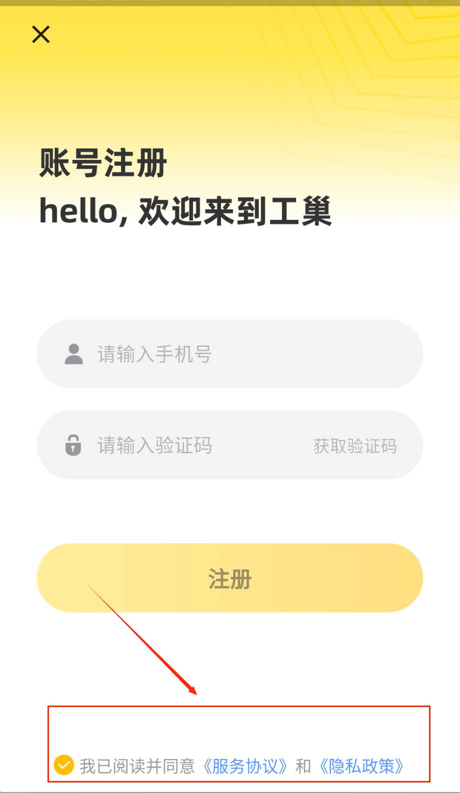 2、收到验证码后仔细输入到验证码框里,别忘了勾选同意协议的小方框,最后点击黄色注册按钮就能完成账号注册啦。