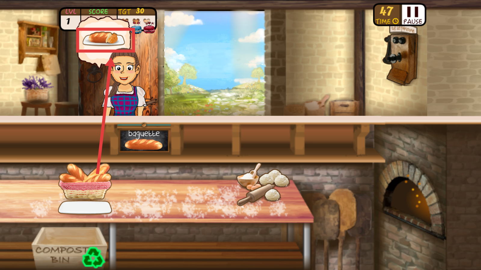 2、顾客头顶会显示想要的面包,根据该提示,从左侧篮子里取出对应的法棍,以此满足顾客需求。