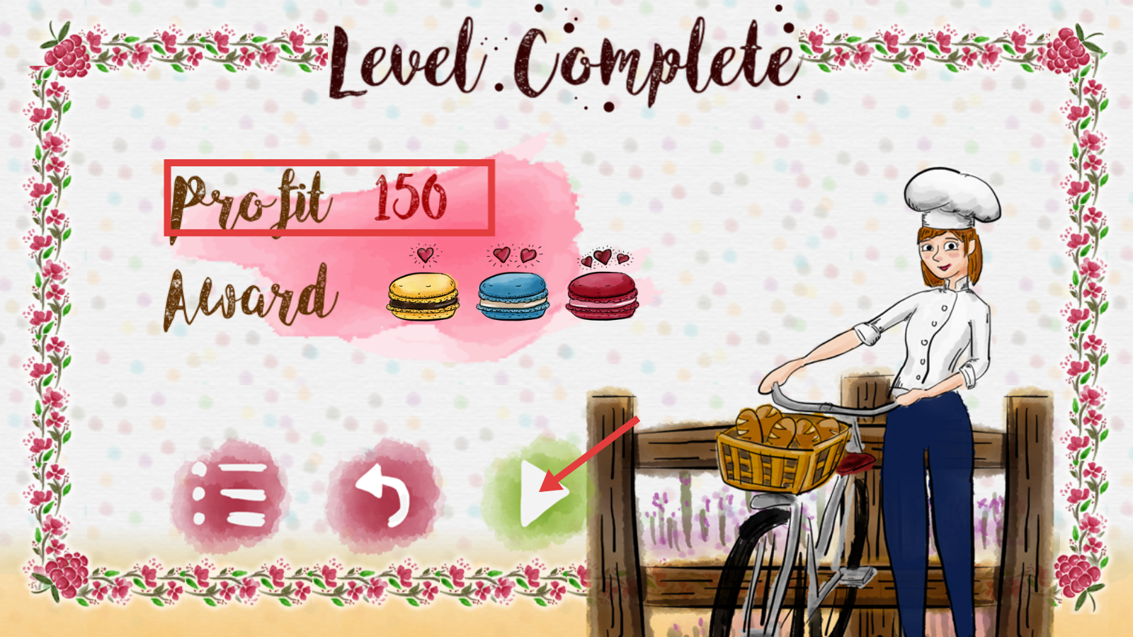 4、关卡完成后会显示【Profit-150】,还能获得马卡龙样式的奖励,点击箭头便可继续挑战下一关。