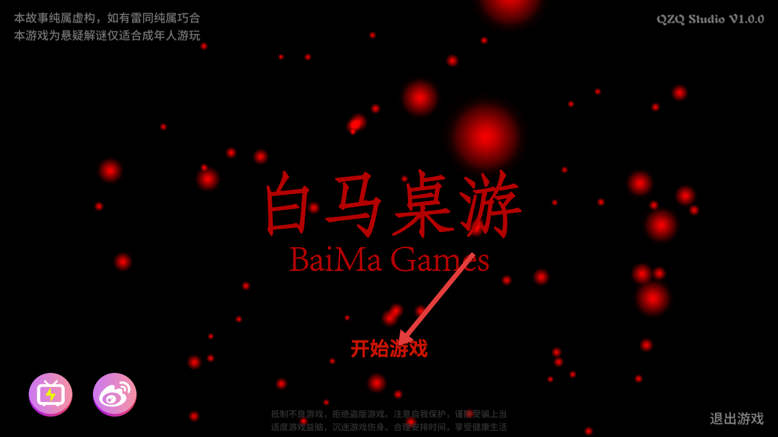 1、进入游戏先点击【开始游戏】,留意界面提示,此为悬疑解谜游戏,仅适合成年人游玩。