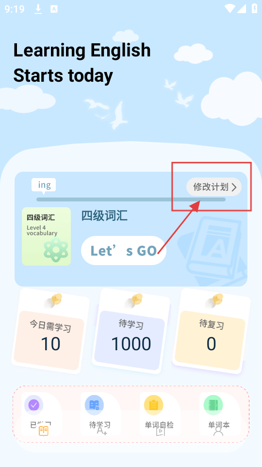 1、进入APP首页,显示学习计划相关,点【修改计划】,可调整学习的词汇等级和每日任务。