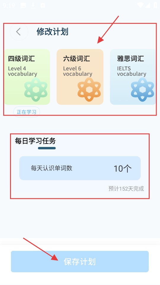 2、在修改计划页,选词汇等级,设置每天认识单词数,点【保存计划】,完成学习计划修改,助力英语学习。