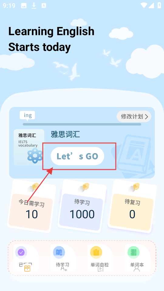 3、计划修改后,回到首页,选好的词汇等级旁有【Let'sGO】,点它,开始进行对应词汇的学习。