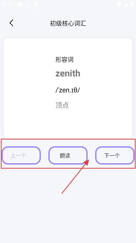 4、进入词汇学习页,显示单词及音标、释义,可点【朗读】听发音,也能点【上一个】【下一个】切换单词学习。