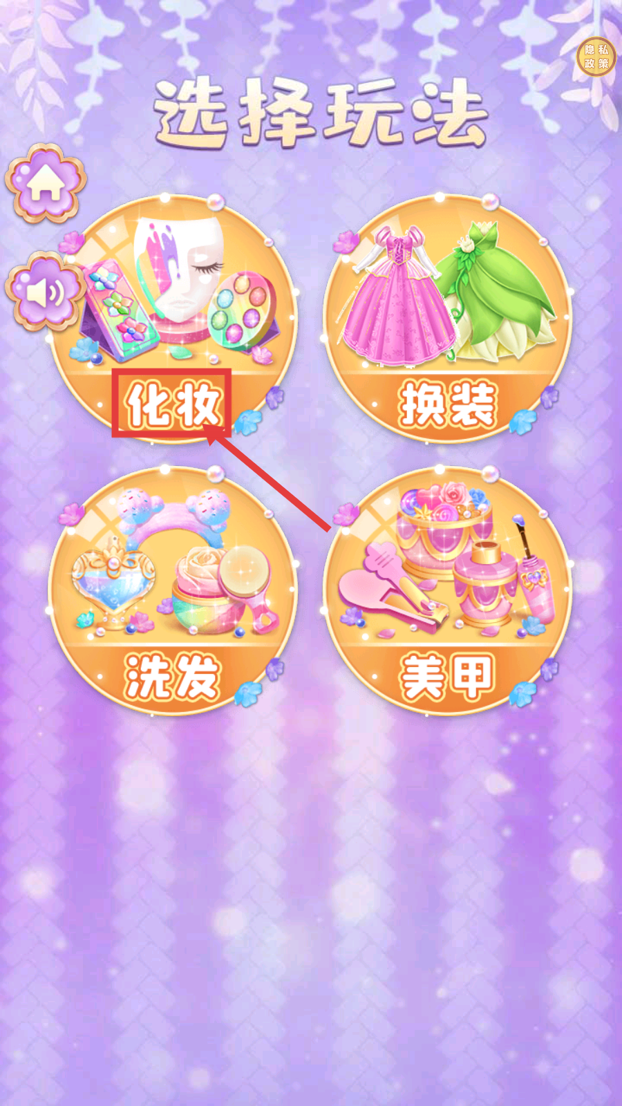 1、进入游戏先选【化妆】玩法,界面有【化妆】【换装】【洗发】【美甲】四个选项,选【化妆】开启美妆之旅。