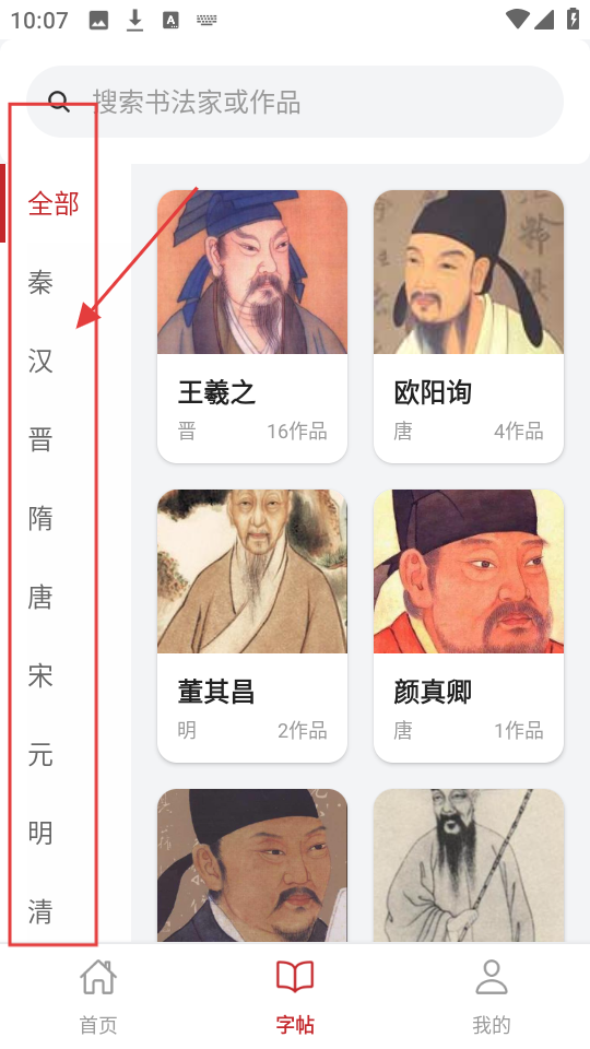 1、进入APP字帖页,左侧有【秦】【汉】等朝代分类,选对应朝代,可查看该朝代书法家。