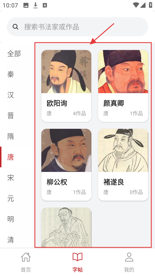 2、选好朝代后,右侧显示该朝代书法家,如唐代的欧阳询、颜真卿等,点书法家,进入其作品集页。