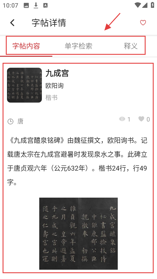 3、在书法家作品集页,有点【九成宫】等作品,选作品,进入字帖详情页,查看字帖内容。
