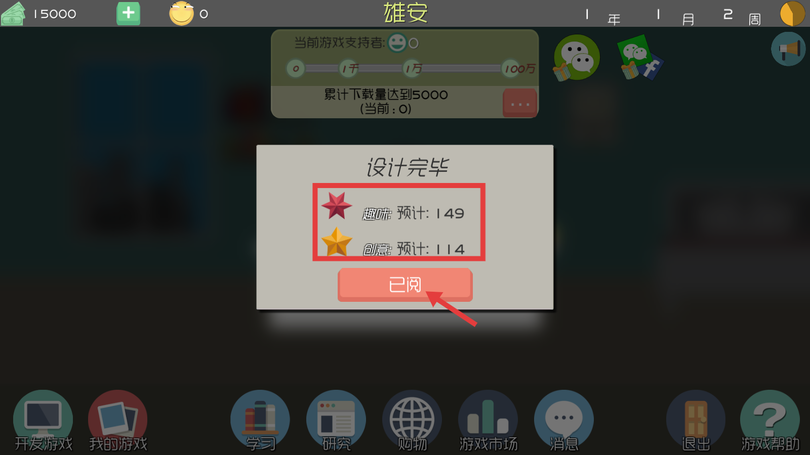 4、设计完毕后,会显示【趣味-预计:149】【创意-预计:114】的数值,点击【已阅】即可进入后续开发环节。