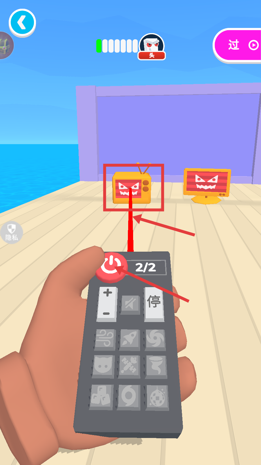 2、用遥控器的红色电源键瞄准黄色带恶魔脸的【电视】,按下电源键关闭它,推进关卡。