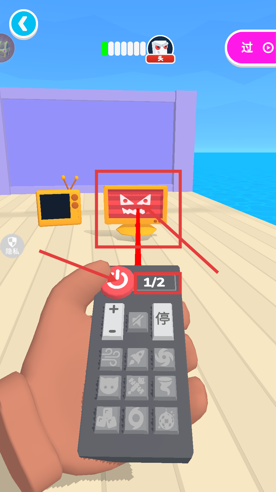 3、继续瞄准另一台带恶魔脸的【电视】,按下电源键关闭,此时遥控器显示【1/2】,完成对应目标。