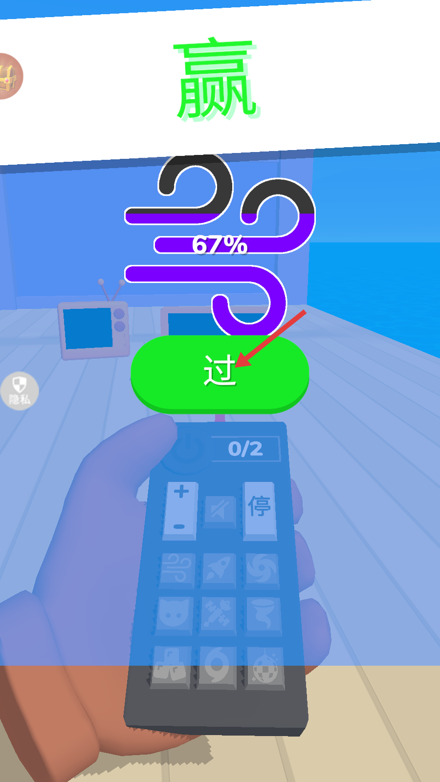 4、成功关闭所有目标后,界面显示【赢】,点击绿色【过】按钮,进入下一个游戏环节。
