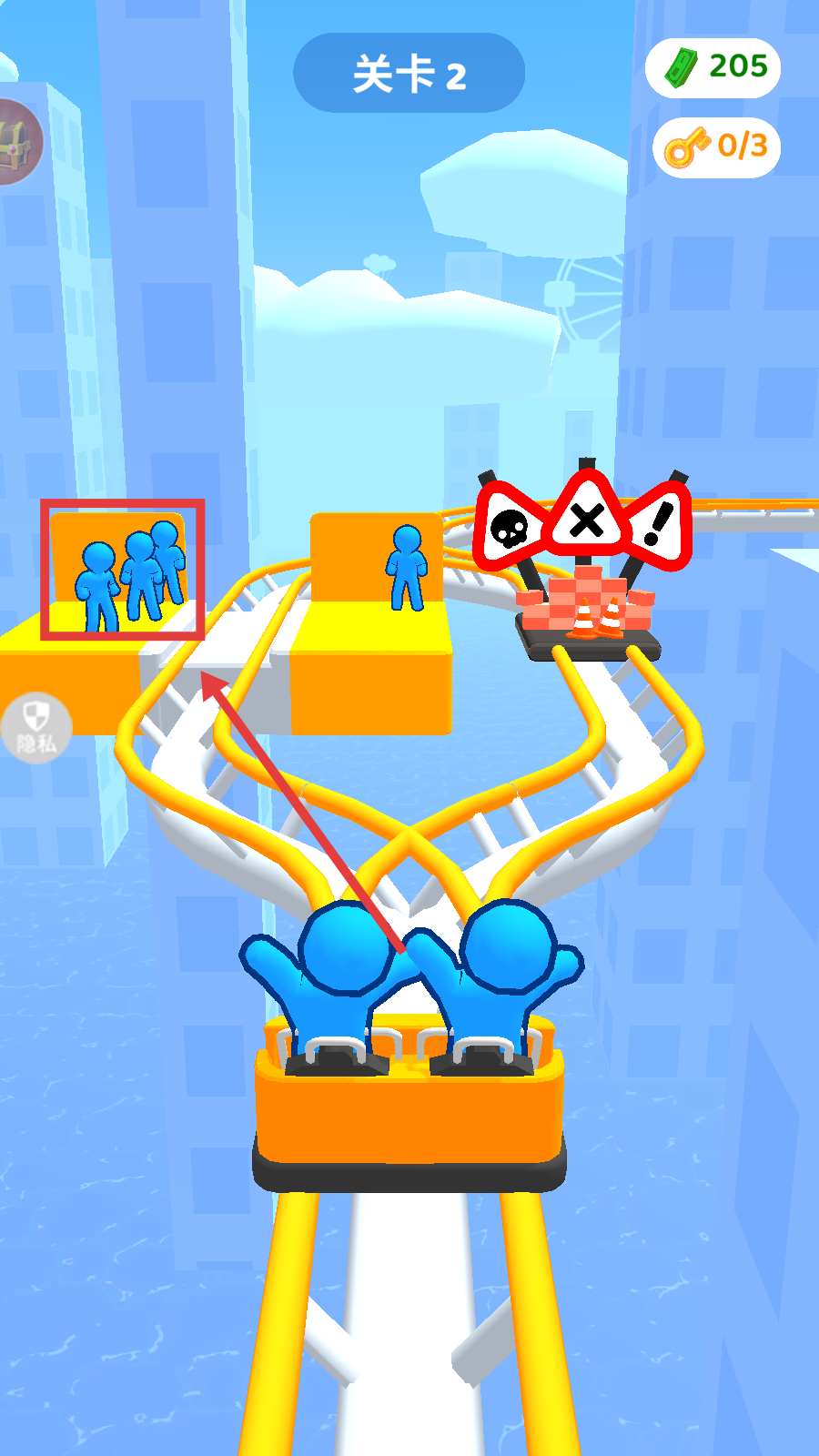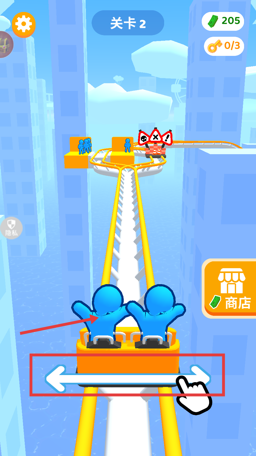 1、在【关卡2】中,操控过山车左右移动(跟随箭头提示),避开带危险标识的障碍,同时靠近蓝色小人所在区域。