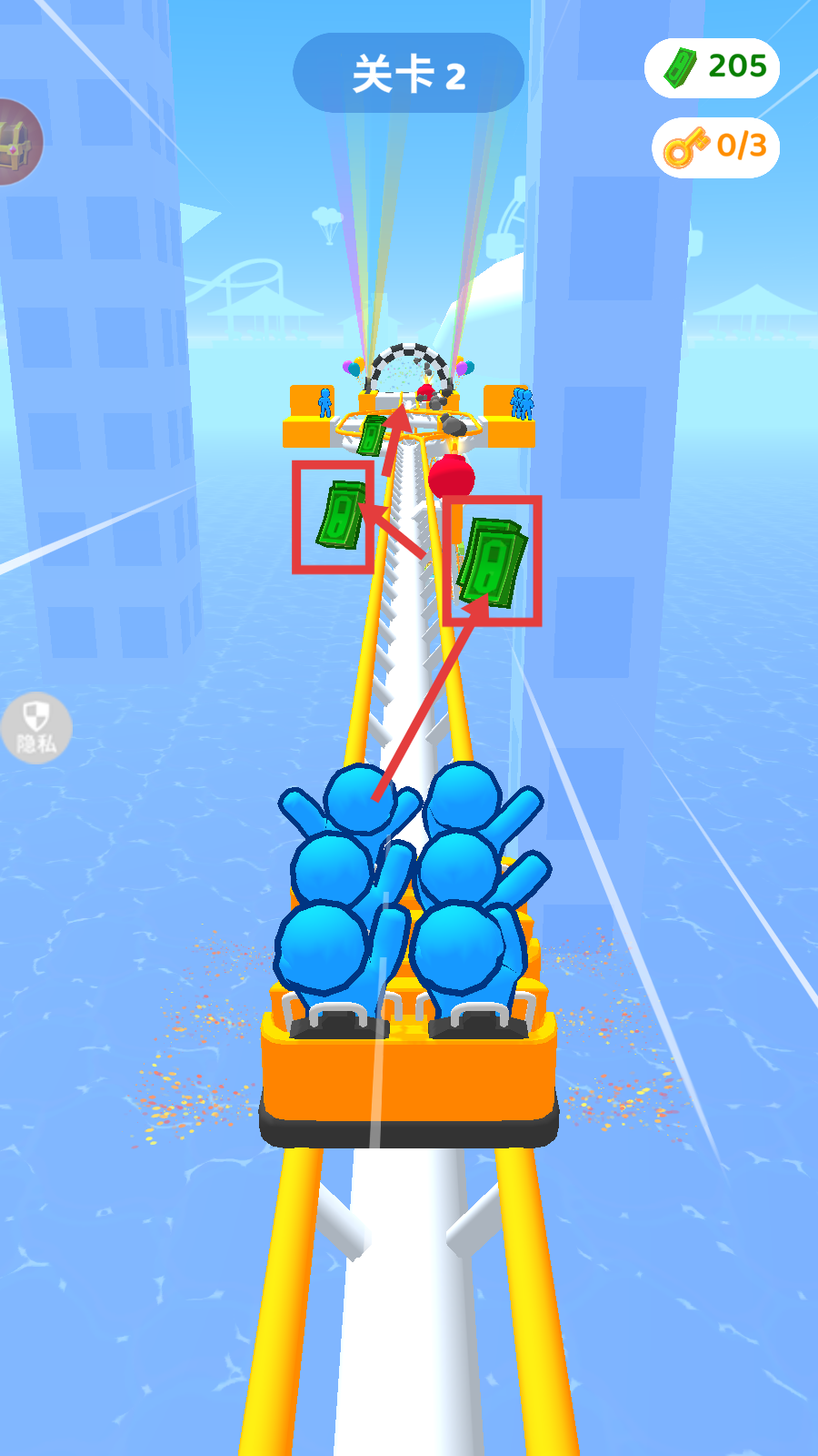 3、接近终点时,收集轨道上的绿色钞票,尽可能多获取,然后朝着终点拱门冲刺。