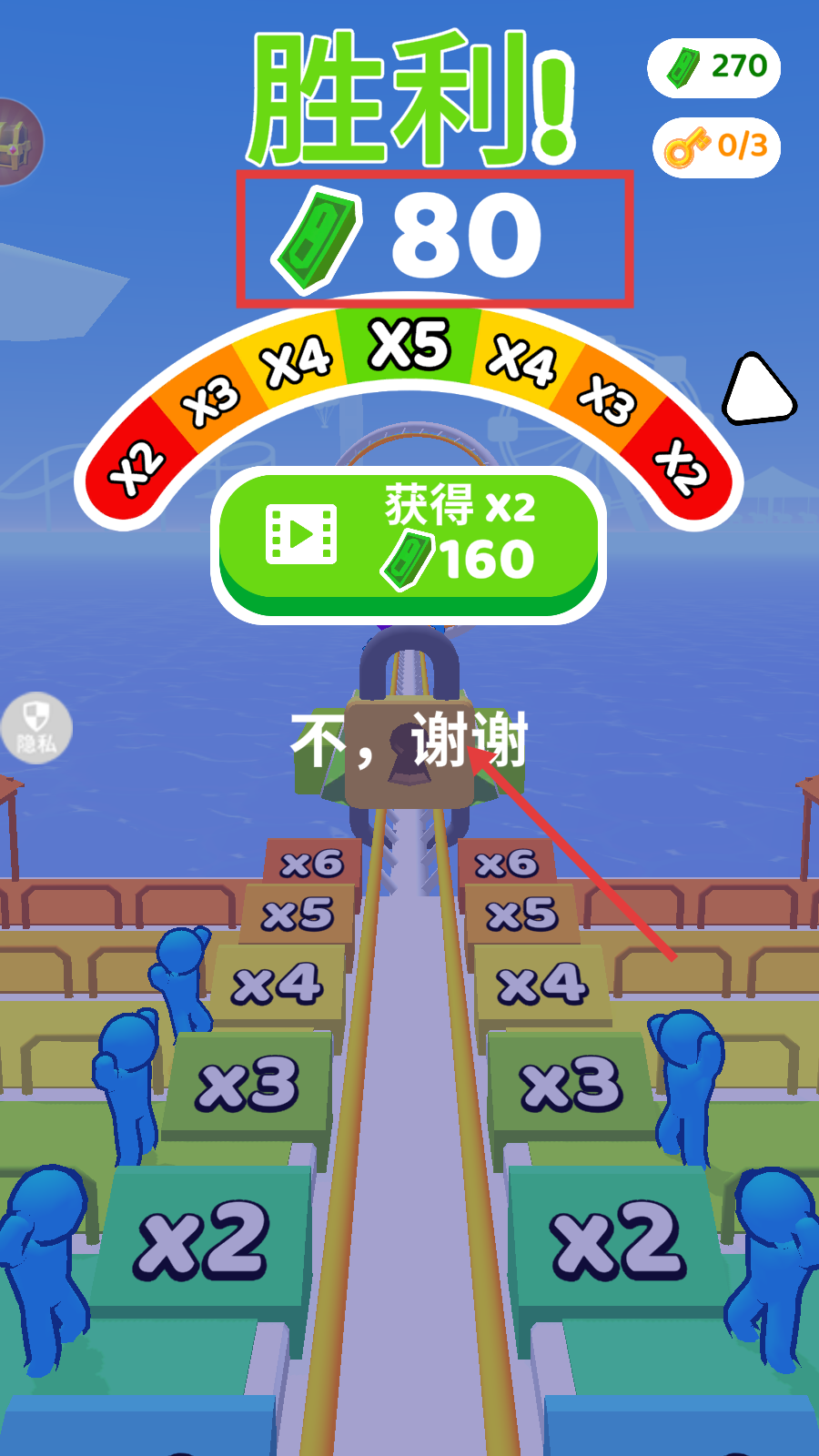4、通关后获得【80】钞票,可点击【不,谢谢】跳过翻倍视频,直接保留奖励,积累资金用于后续关卡。