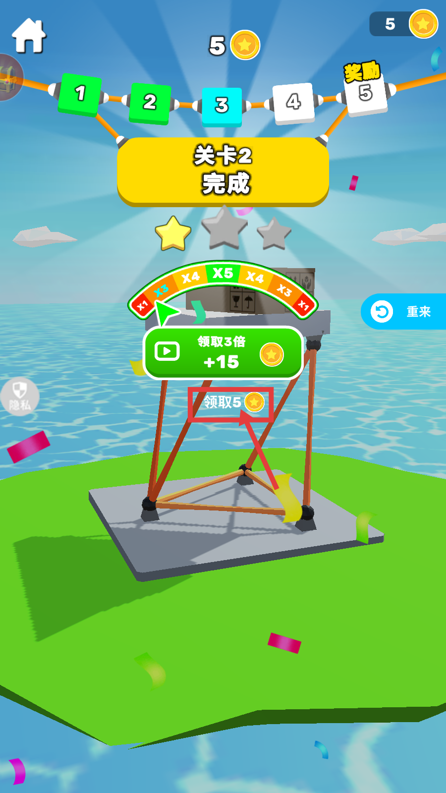 4、通关【关卡2】后,界面显示“关卡2完成”,点击【领取5】金币的选项,获取通关奖励,积累金币用于后续关卡。