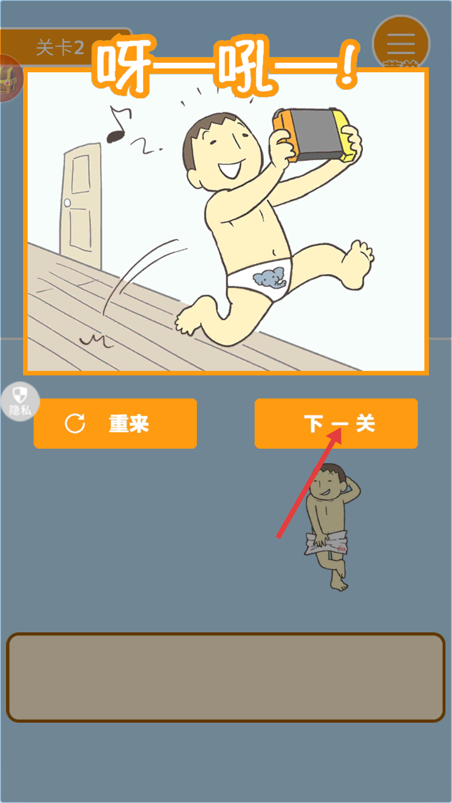 4、成功完成【关卡2】后,界面显示“呀——吼——!”的通关画面,点击橙色【下一关】按钮,进入后续关卡。