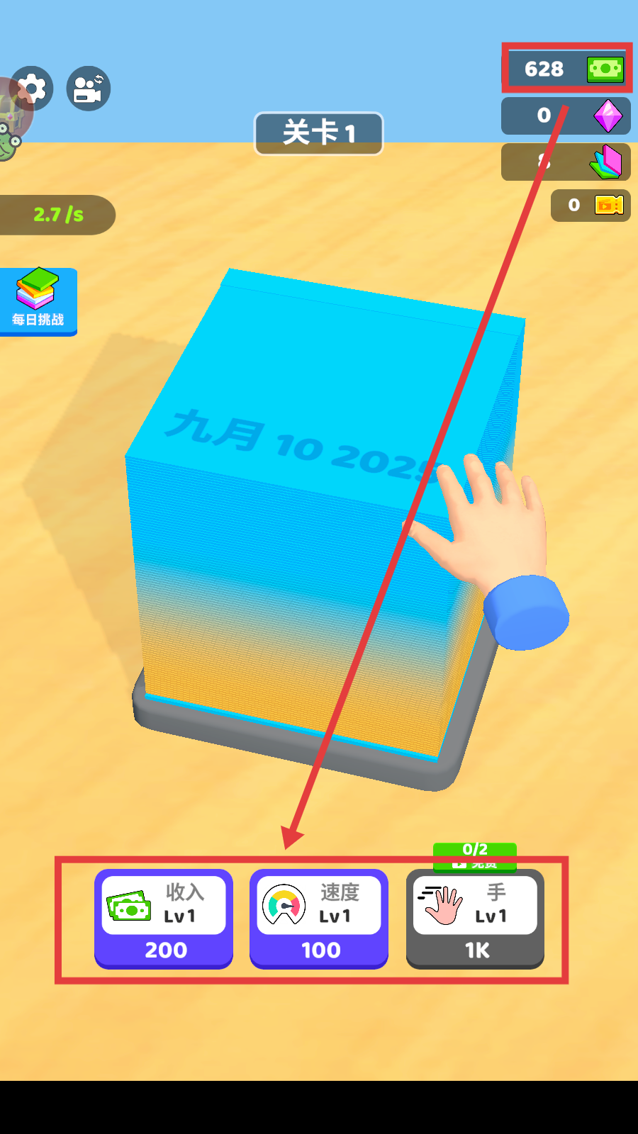2、进入【关卡1】后,界面底部有【收入】【速度】【手】三个可升级选项,优先升级这些属性,提升后续操作效率。