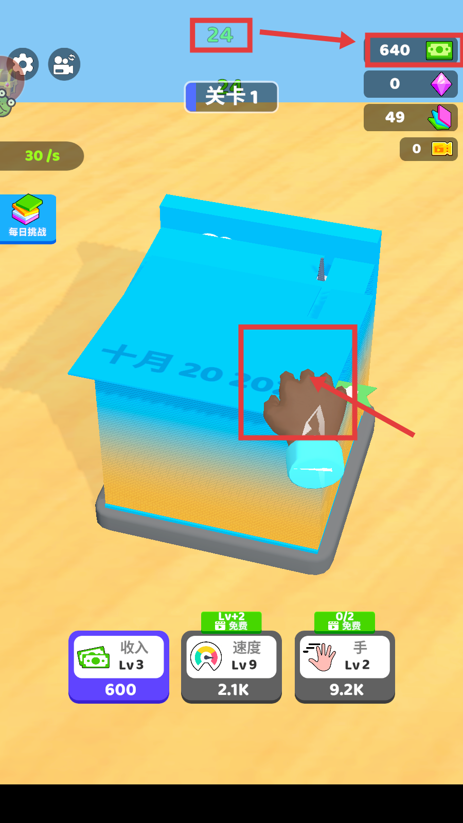 3、操作方块时,借助升级后的属性,让右上角金钱数值不断增加,同时观察操作带来的进度变化(如上方数字)。