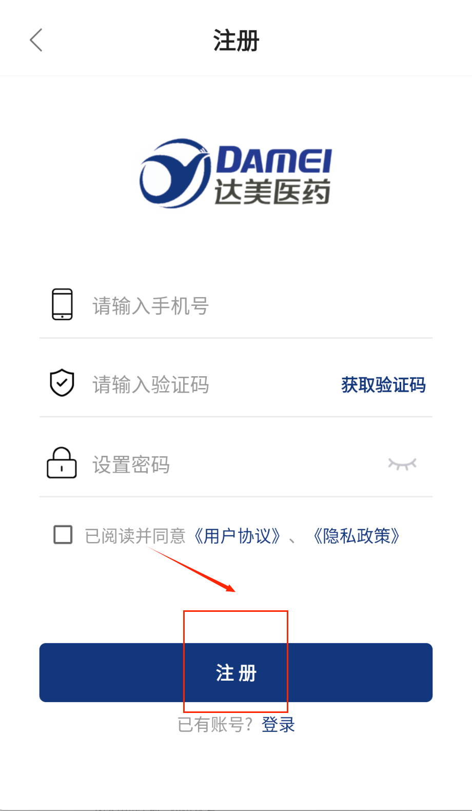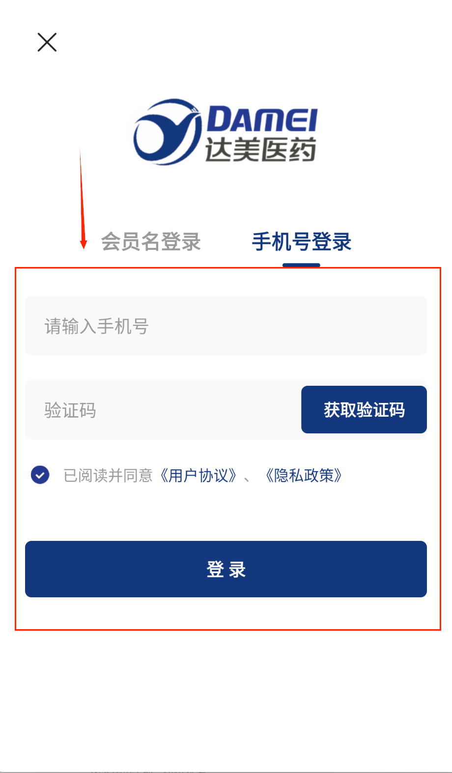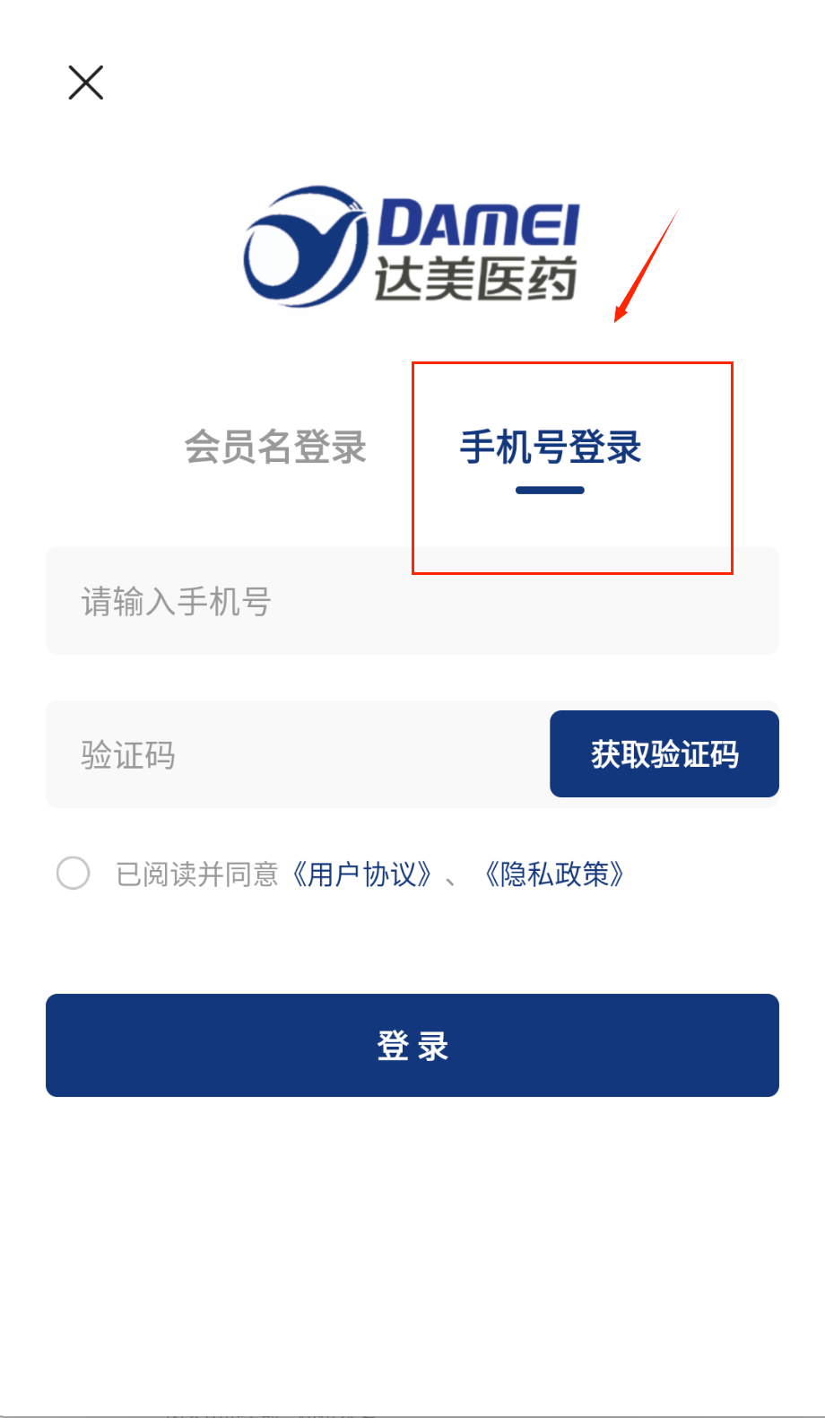 1、打开达美医药软件后首先会看到蓝色标志的欢迎界面,选择手机号登录方式后依次填写注册时使用的手机号码,点击获取验证码按钮。