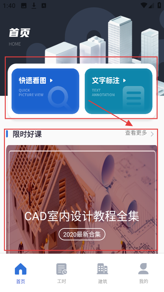1、进入APP首页,有【快速看图】【文字标注】功能,还有限时好课,可学CAD室内设计教程全集。