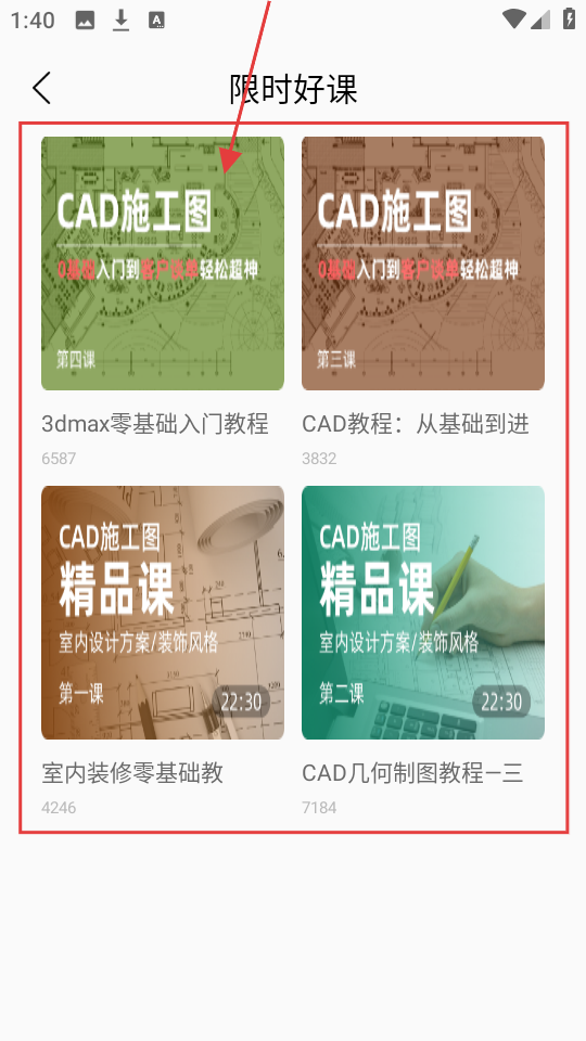 2、在限时好课页,有CAD施工图、3dmax等课程,选感兴趣的课程,开启学习之旅。