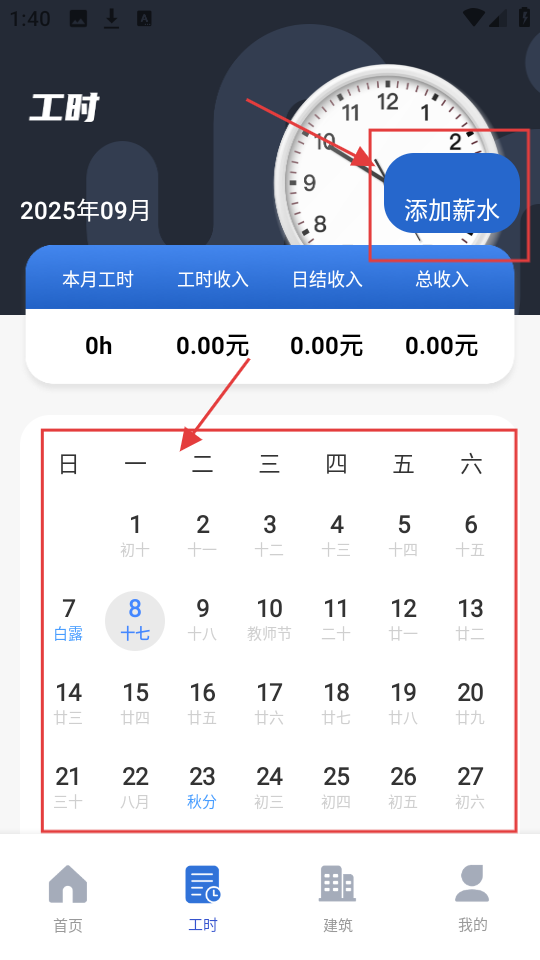 4、切换到工时页,能看本月工时、收入等,点【添加薪水】,可记录收入,日历还能查看日期。