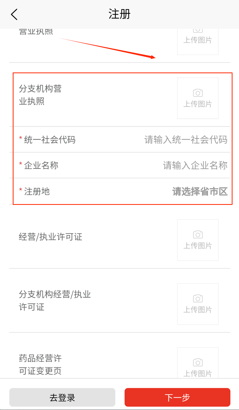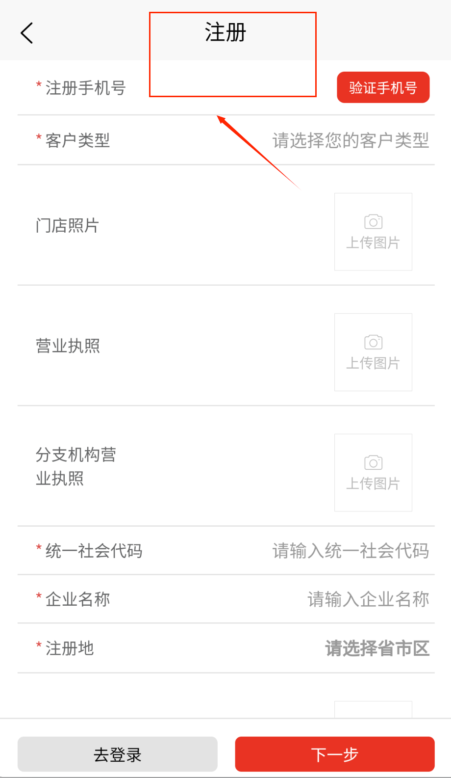 1、打开软件后点击注册按钮进入注册页面,需要先输入手机号获取验证码完成初步验证,然后选择客户类型并上传门店照片和营业执照等材料。