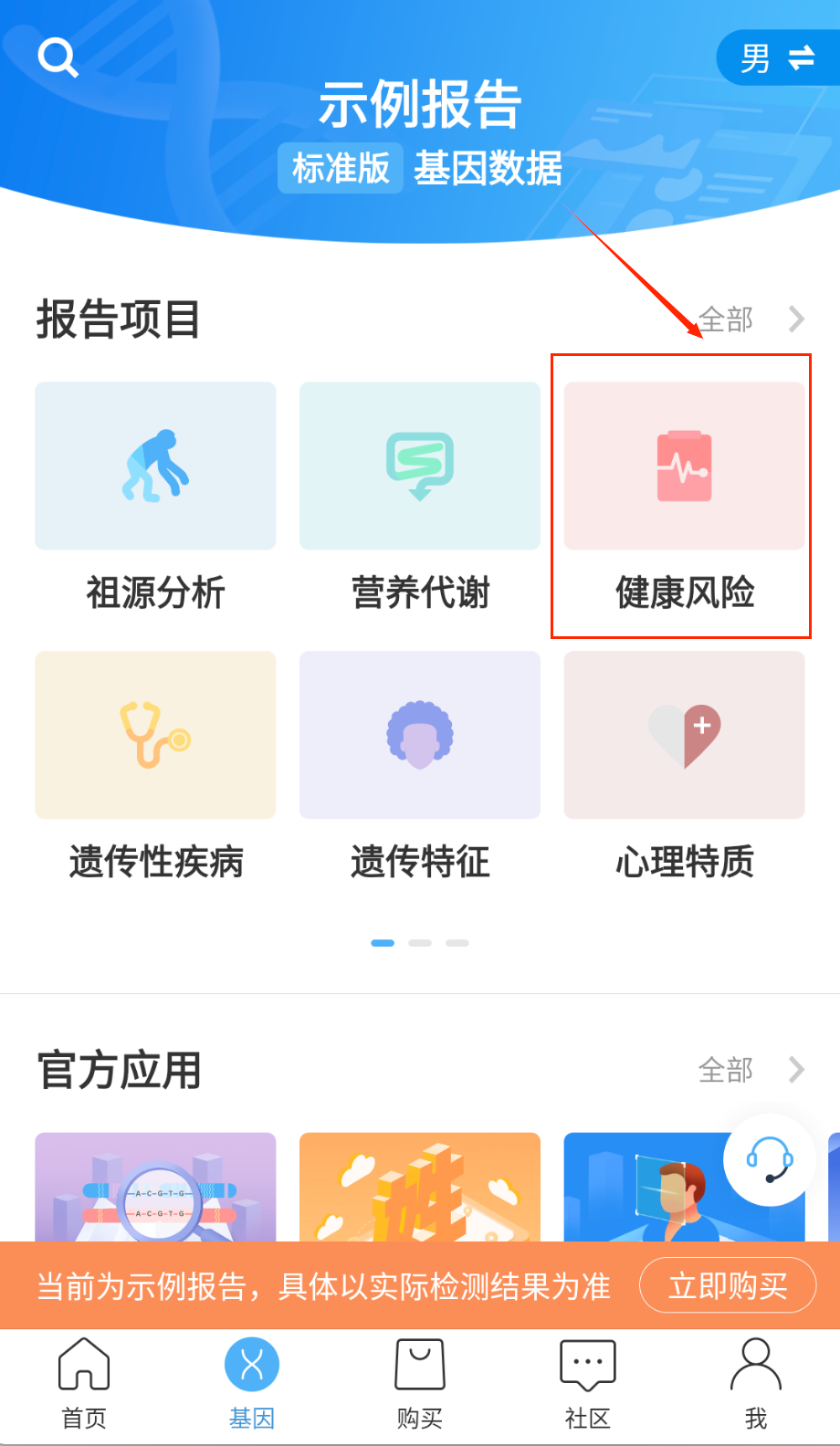 3、健康风险评估板块会基于用户的基因检测结果,运用科学算法预测200多种潜在疾病风险,同时提供专业的预防建议和定期筛查提醒。
