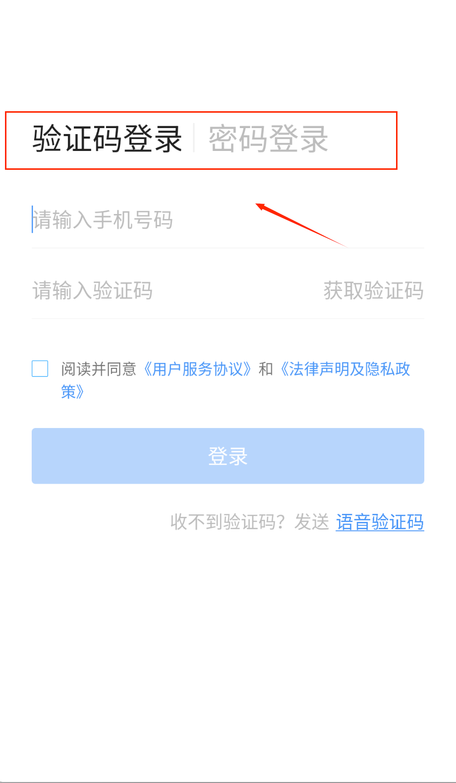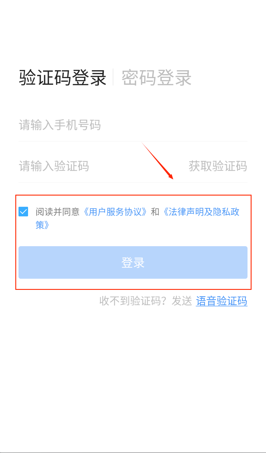 1、打开软件后首先会看到登录界面,在顶部可以选择验证码登录或密码登录方式,建议选择适合你的登录方法进行操作呢。
