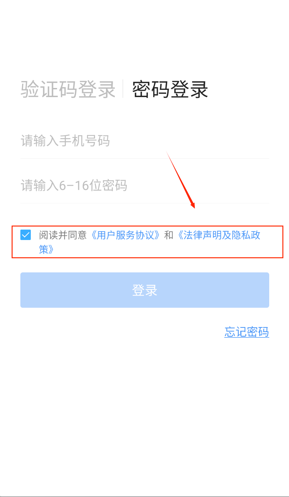 2、如果选择密码登录需要先输入注册时使用的手机号码,然后在密码框输入6到16位的登录密码,点击右侧眼睛图标可以查看密码。