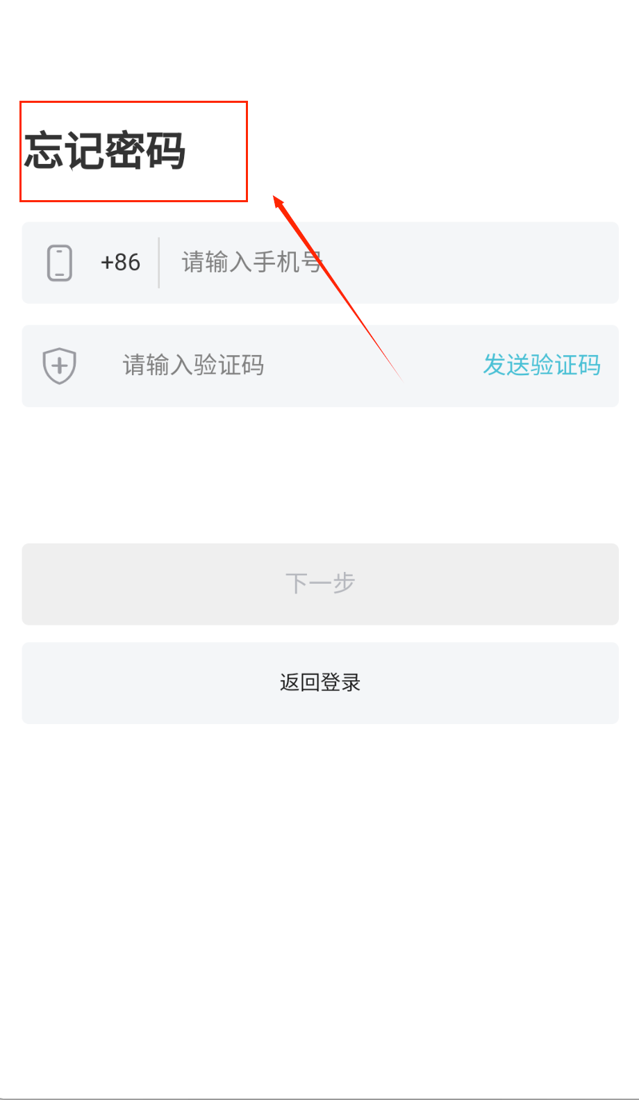 1、如果你忘记密码了,可以在登录界面点击忘记密码选项,进入密码找回页面后选择中国区号+86并输入手机号码,点击发送验证码按钮。