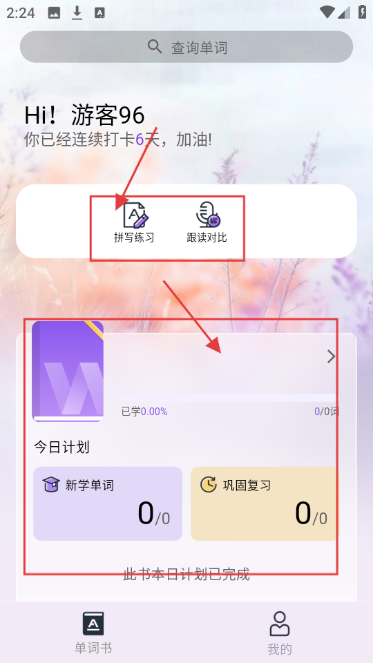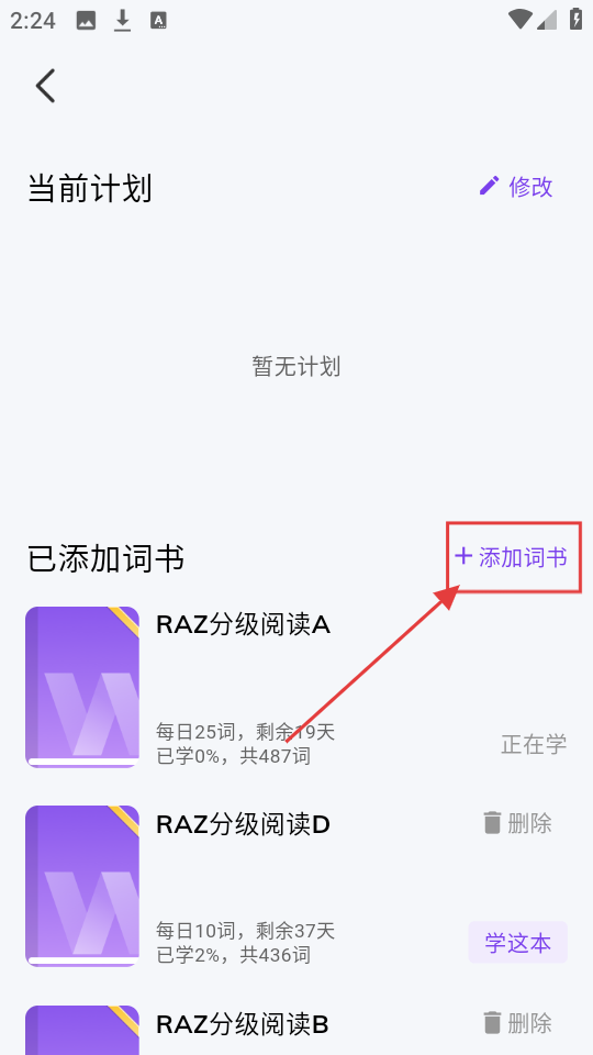2、在计划页,若当前无计划,点【+添加词书】,可添加新的词书,丰富学习内容。