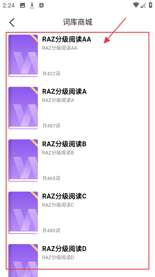 3、进入词库商城,有RAZ分级阅读AA、A等多类词书,选适合自己的词书,为学习做准备。