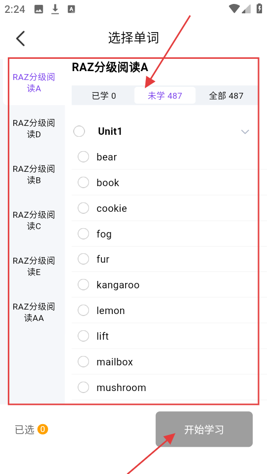 4、选好RAZ分级阅读A词书后,在未学单词列表里选要学的单词,点【开始学习】,开启单词学习。