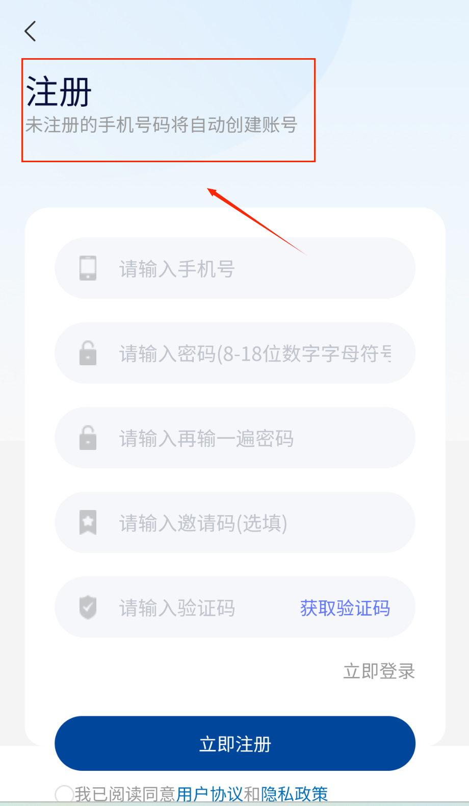 4、最后在盾牌图标的验证码框点“获取验证码”按钮,等短信来了填进去,勾选同意用户协议的小圆圈,点击蓝色注册按钮就完成账号创建啦。