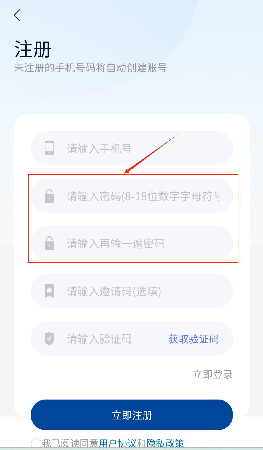 2、接着在两个带锁头图标的密码框设置密码,第一个框输入8-18位包含数字、字母、符号的组合密码,第二个框重复输入相同密码确保一致。