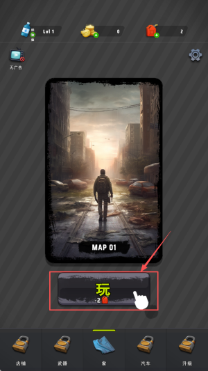 1、如何进入地图关卡?点击“MAP01”,选择“玩”进入第一关,可提前进入“店铺”或查看“汽车”装备。
