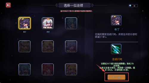 2、如何选择法师?点击“选择一位法师”,查看角色技能如“连锁闪电”,点击“下一步”确认选择。